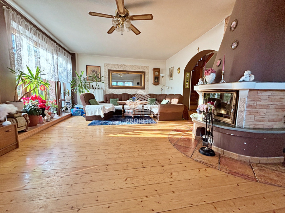 - obszerny salon z kominkiem (ok. 30m2) z kuchnią z oknem (ok. 8,8m2)SE-SW i wyjściem na przestronny taras.