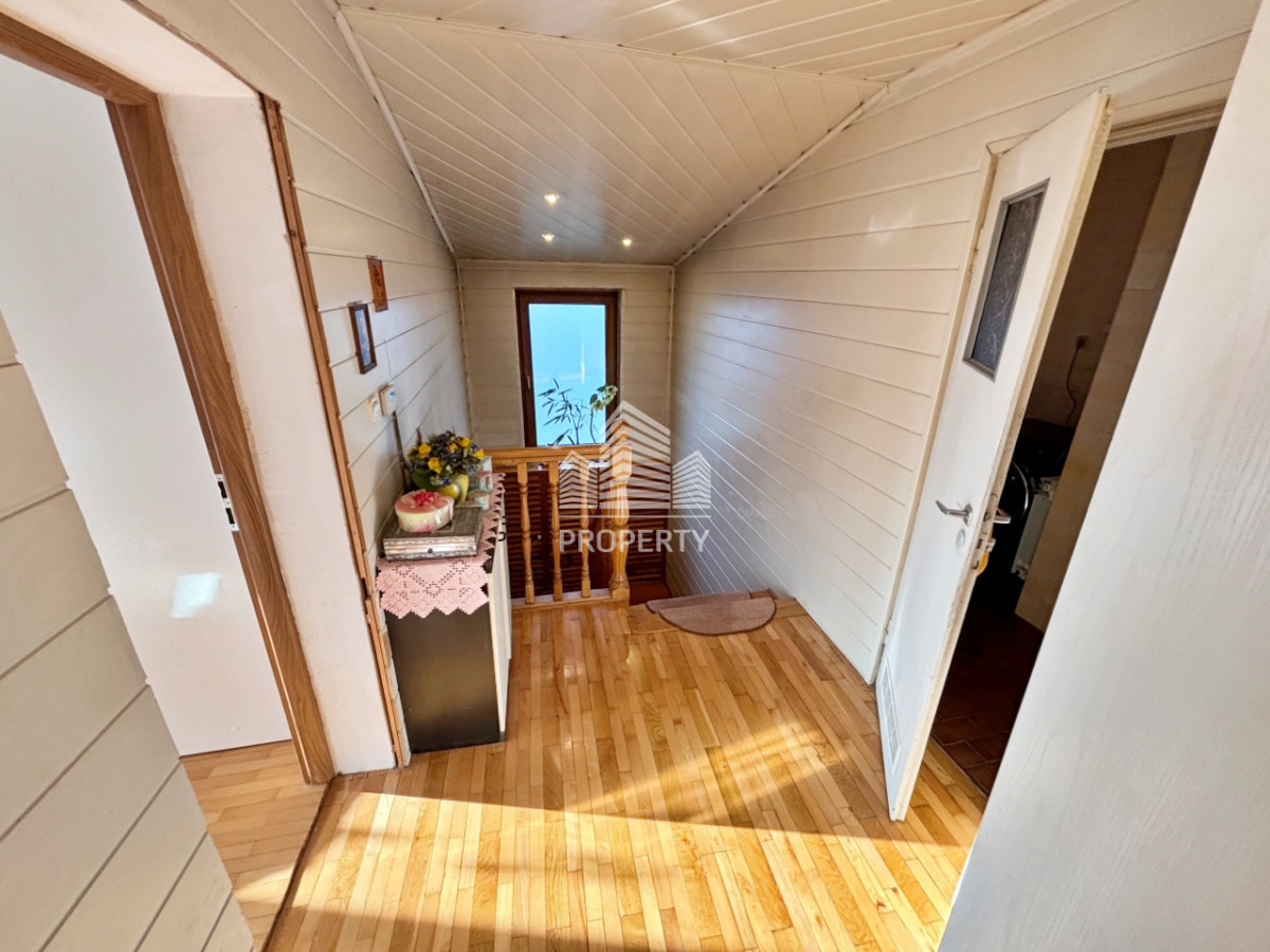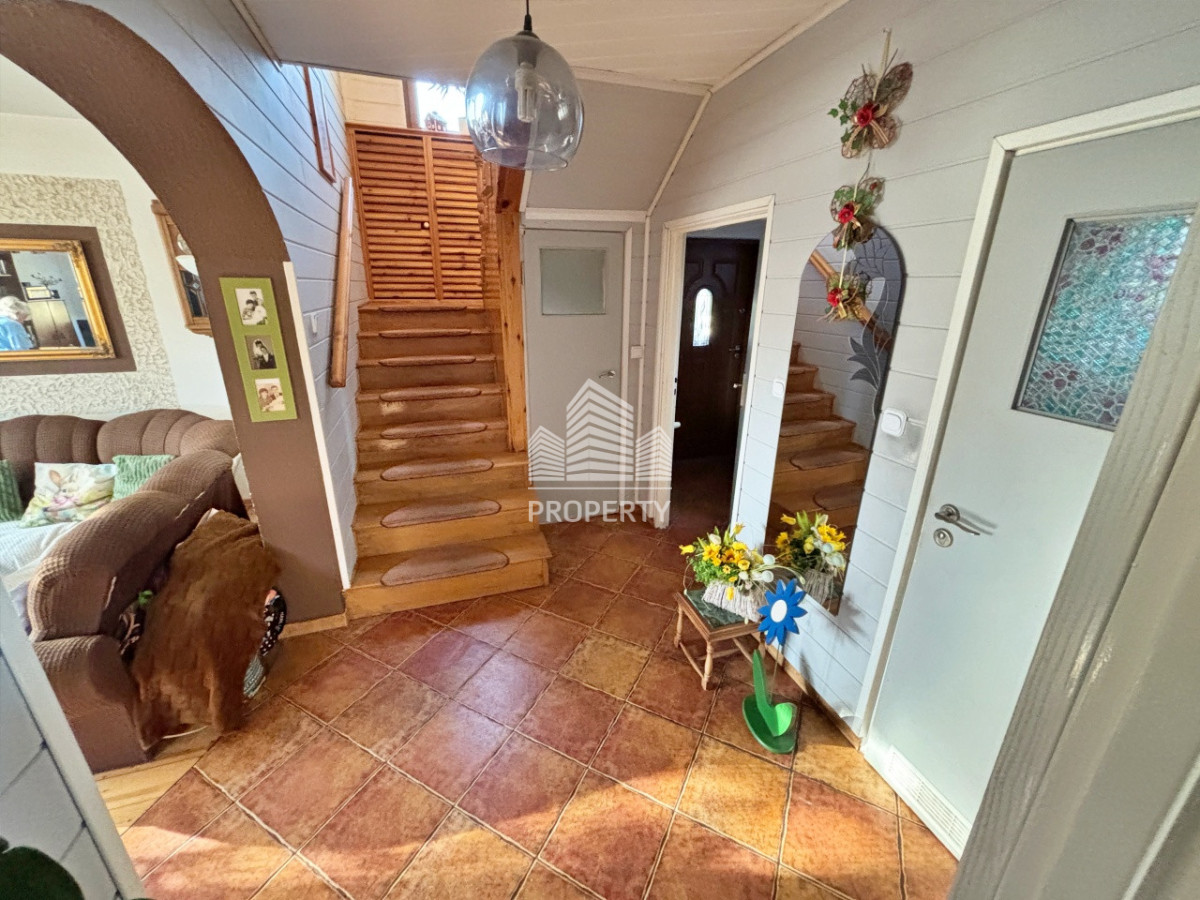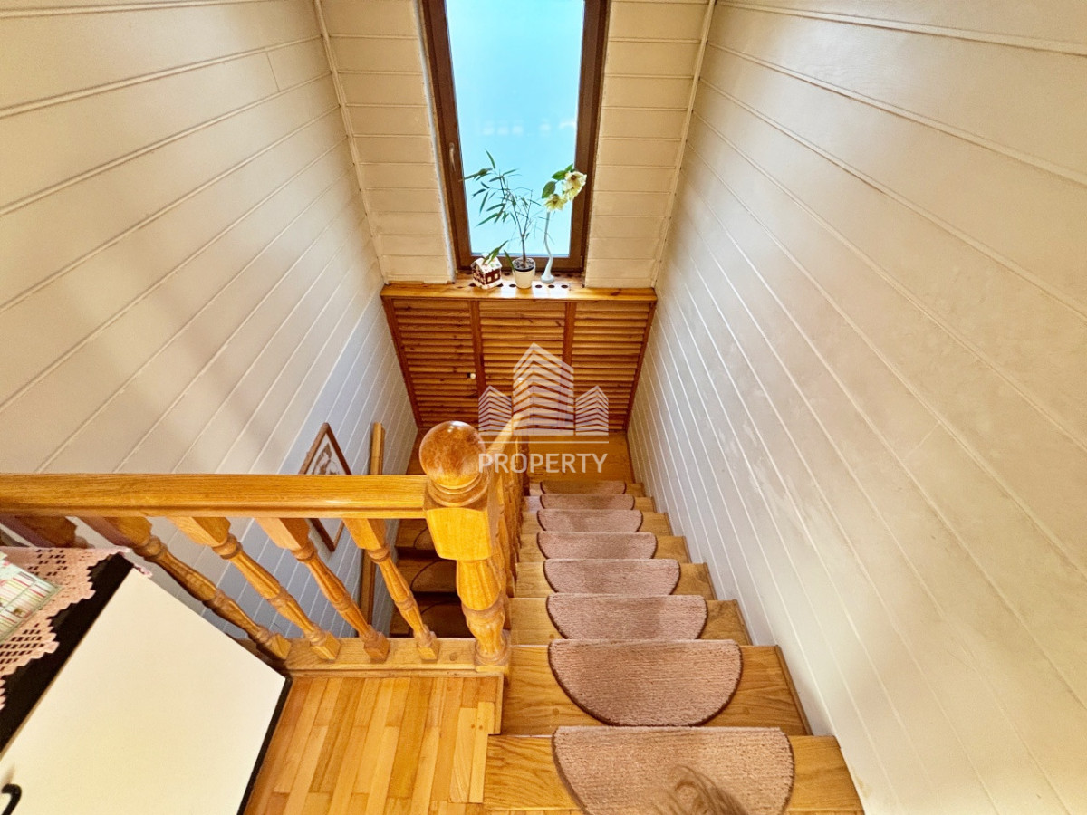 Dom posiada drewniane schody, okna plastikowe oraz płaski dach wyłożony papą z obudowaniem blachy, dzięki czemu pomieszczenia na piętrze są obstawne (brak skosów).