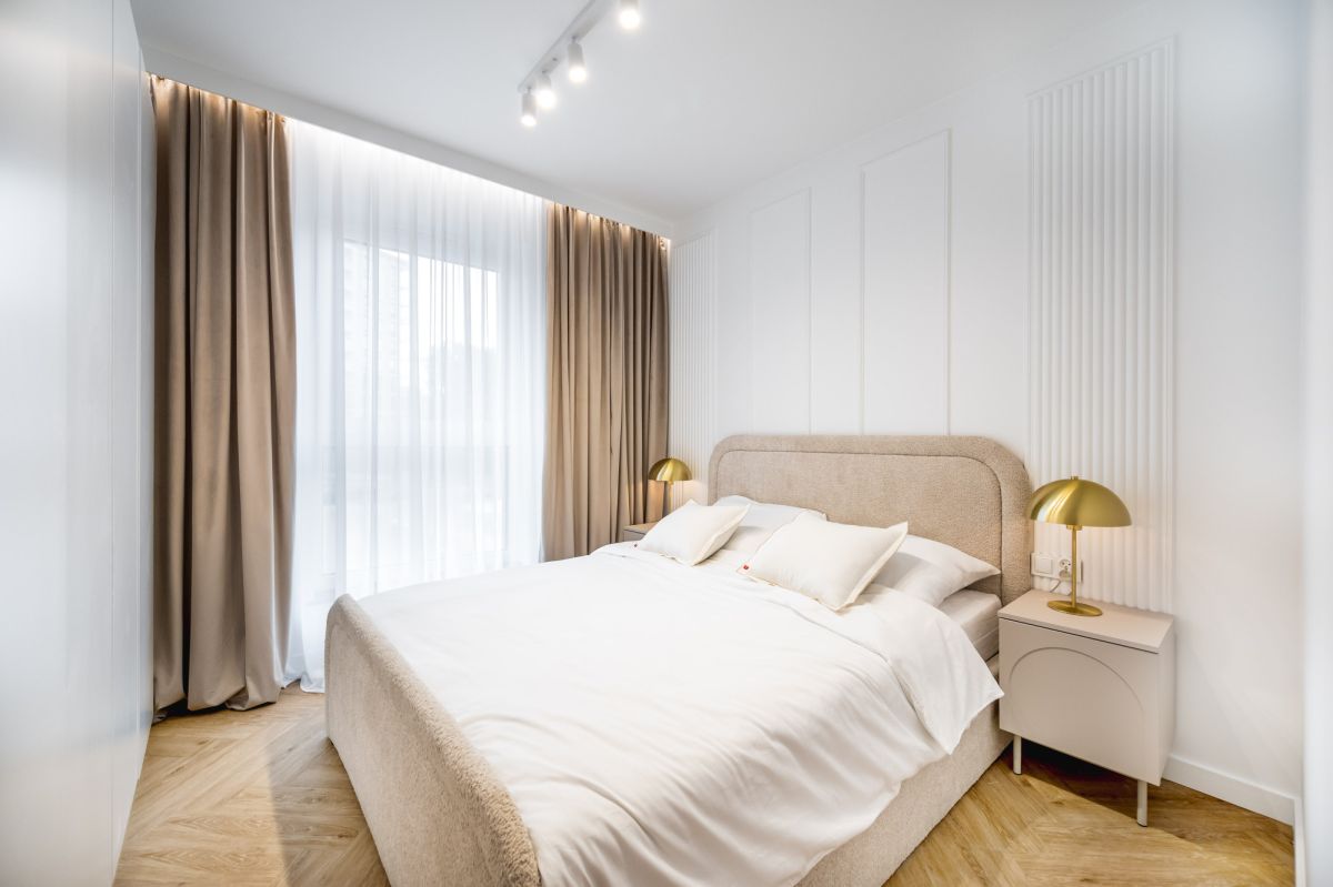 SYPIALNIA z dużym łożem z zagłówkiem wykonanym na zamówienie u tapicera. Otwierane na całej szerokości 2 pojemniki (kolejne pojemne miejsce do przechowywania). Duże pojemne szafy na przechowanie rzeczy jak w garderobie. Stoliki nocne i lampy nadające charakter sypialni. Dodatkowo podświetlane karnisze LED sterowane pilotem, nadające piękną i przytulną atmosferę w sypialni.
