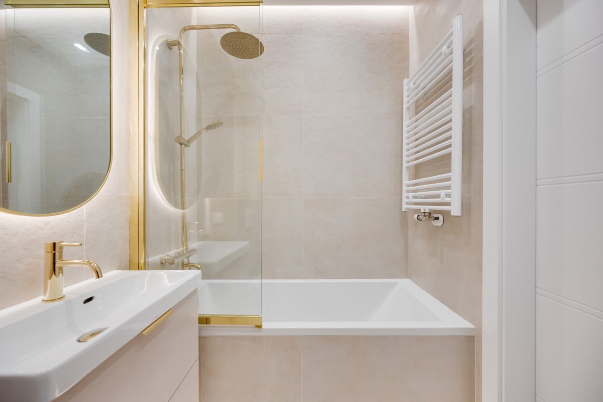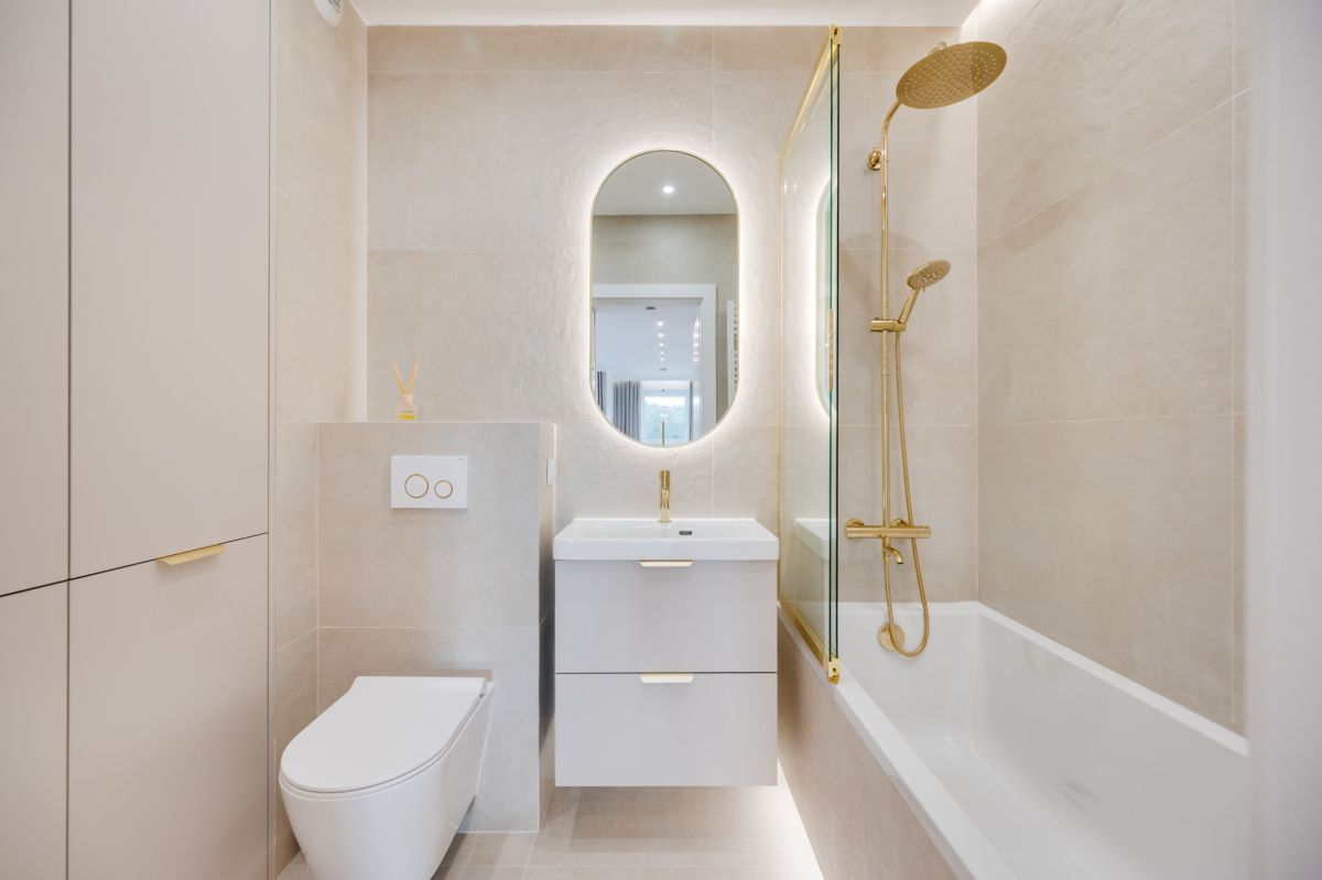 ŁAZIENKA z wanną ( z możliwością prysznica), w części głównej łazienki WC GEBERIT, miejsce na pralkę jak i suszarkę schowaną w szafce, szafki z głębokimi szufladami, umywalka nablatowa, ręczniczki, lustro LED.