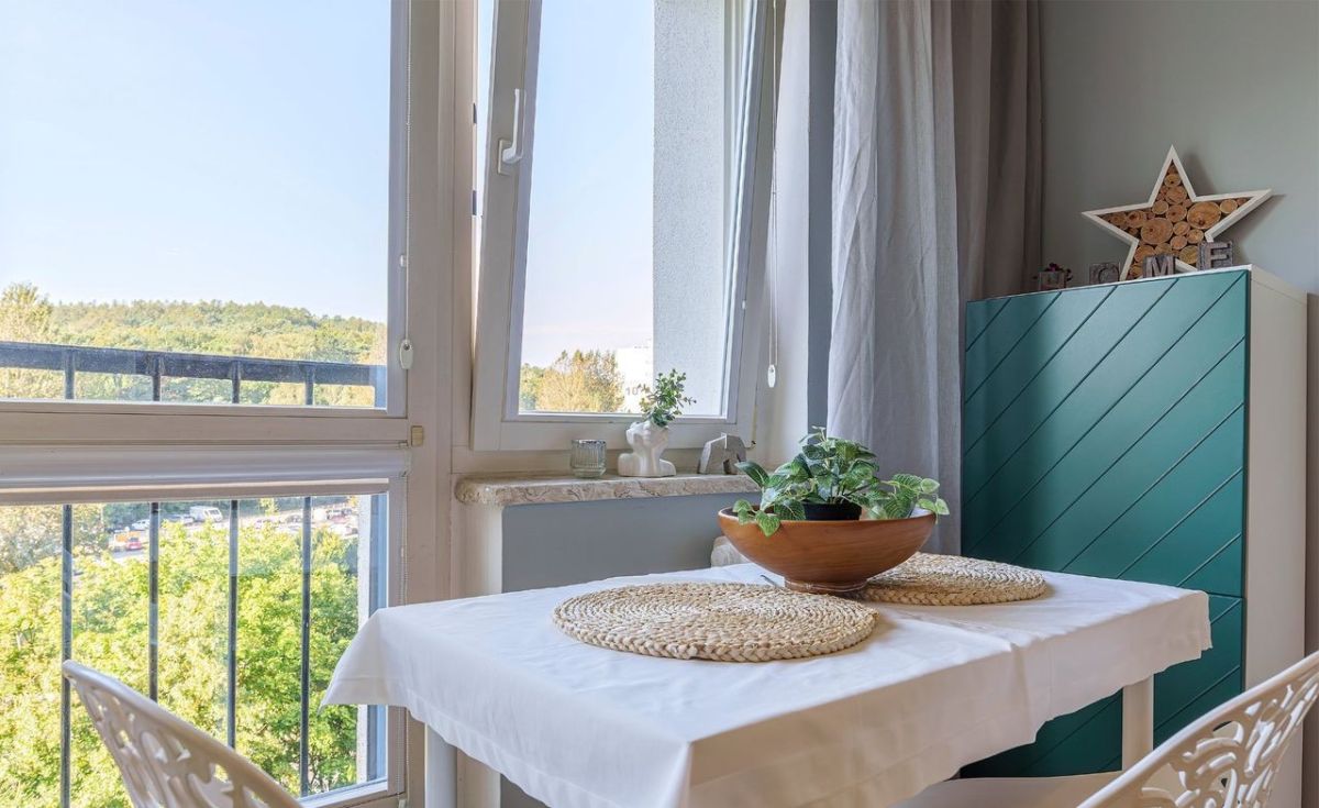 Mieszkanie jest bardzo ciepłe i słoneczne, z ekspozycją południową w pokoju i kuchni. Z okien rozpościera się widok na las, co tworzy kameralny klimat i zapewnia prywatność.
