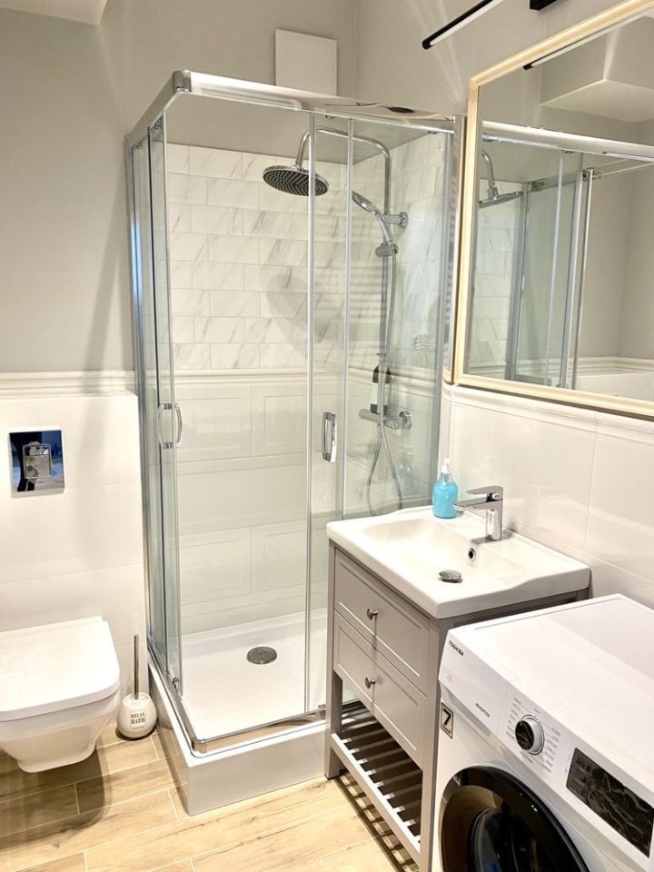 - Mieszkanie składa się z salonu z aneksem kuchennym i łazienki z prysznicem.