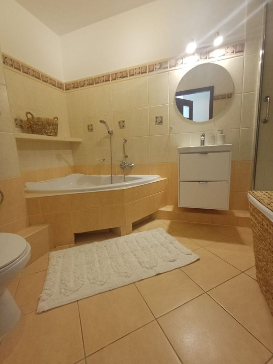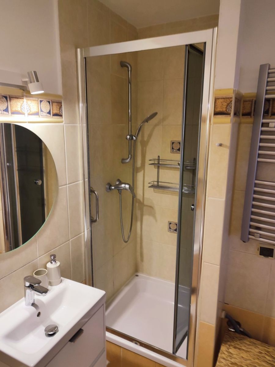 - Przestronnej łazienki z wanną i prysznicem (pralka),