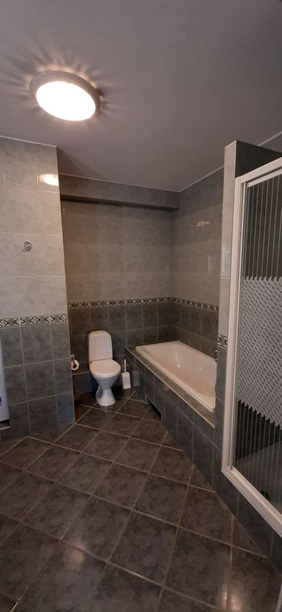 - duża łazienka (wanna, kabina prysznicowa, WC, bidet, pralko-suszarka)