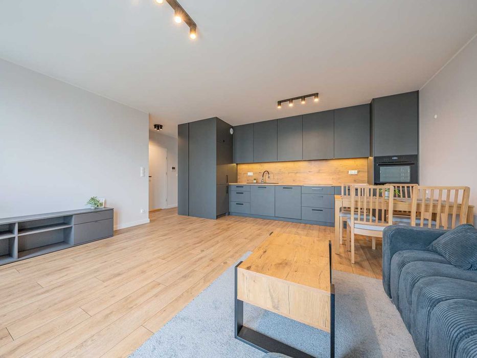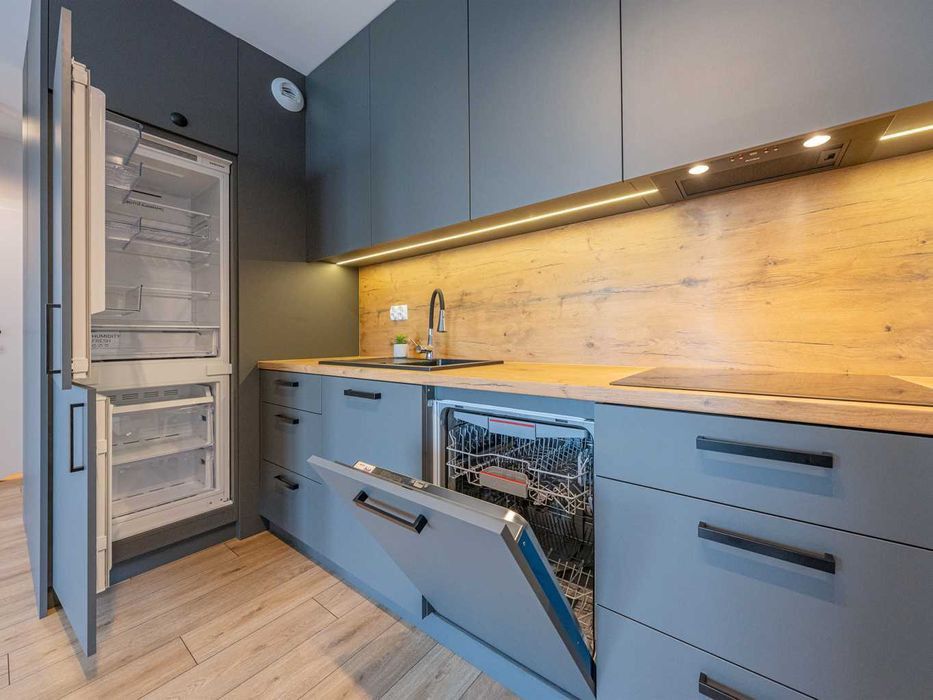 Salon z aneksem kuchennym, w pełni umeblowana kuchnia z nowoczesnym sprzętem AGD - w tym zmywarka.
