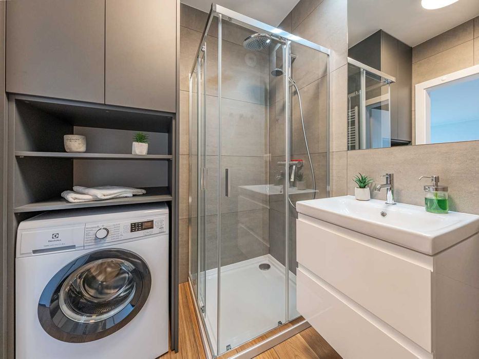 Łazienka z prysznicem i pralką,