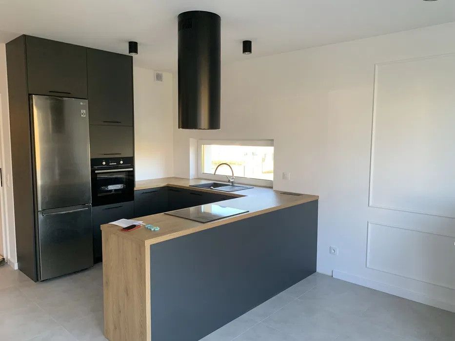 • Jasny salon z aneksem kuchennym (piekarnik, okap, zmywarka, płyta, lodówka)