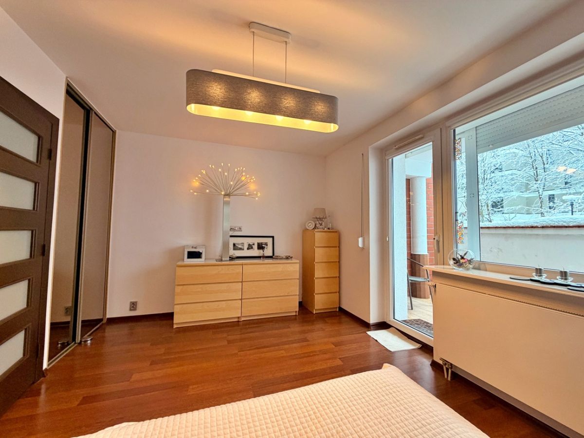 - Duża, ustawna sypialnia z bezpośrednim wyjściem na taras, zapewniająca komfort i prywatność.
