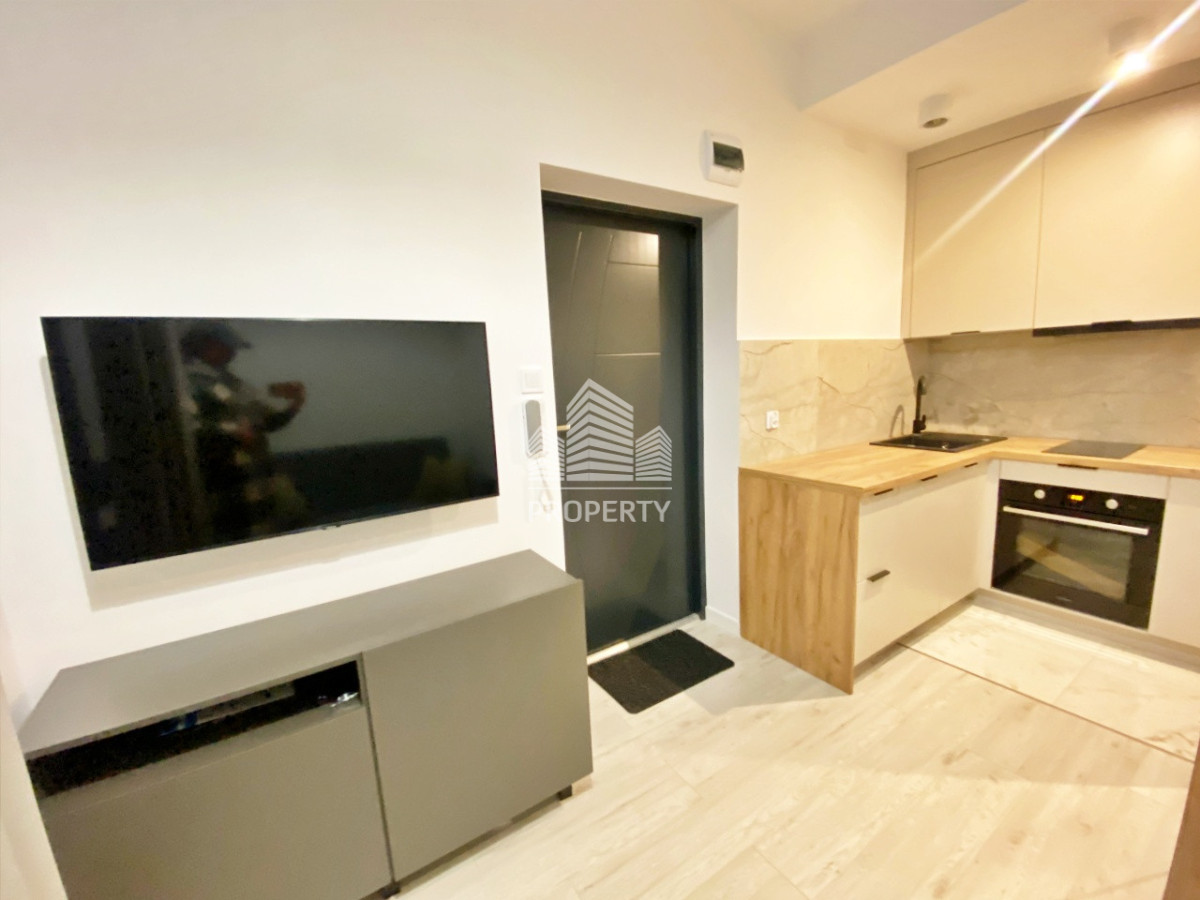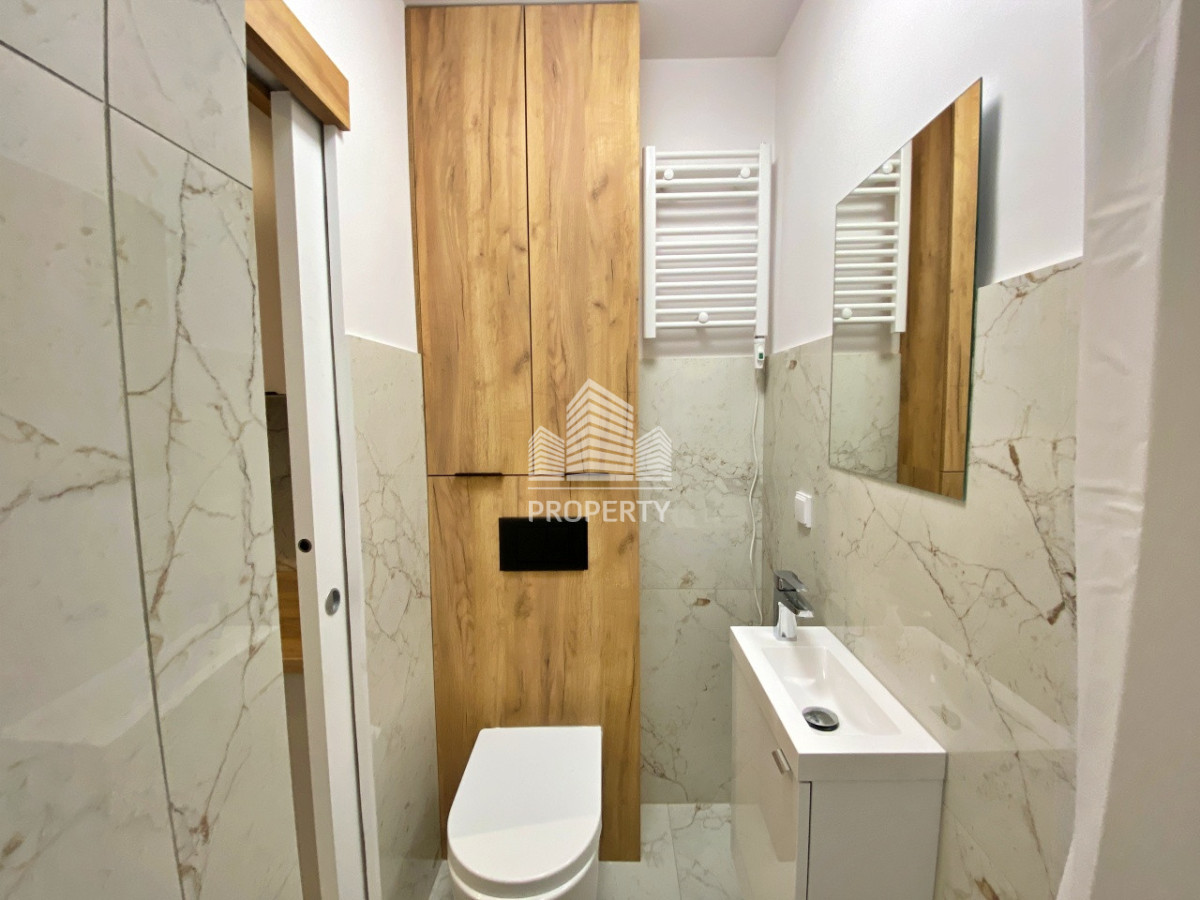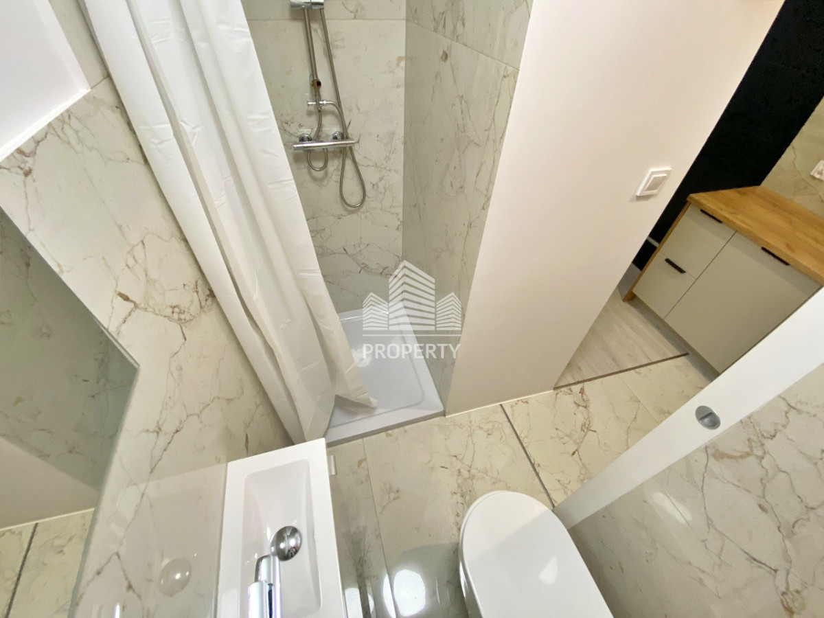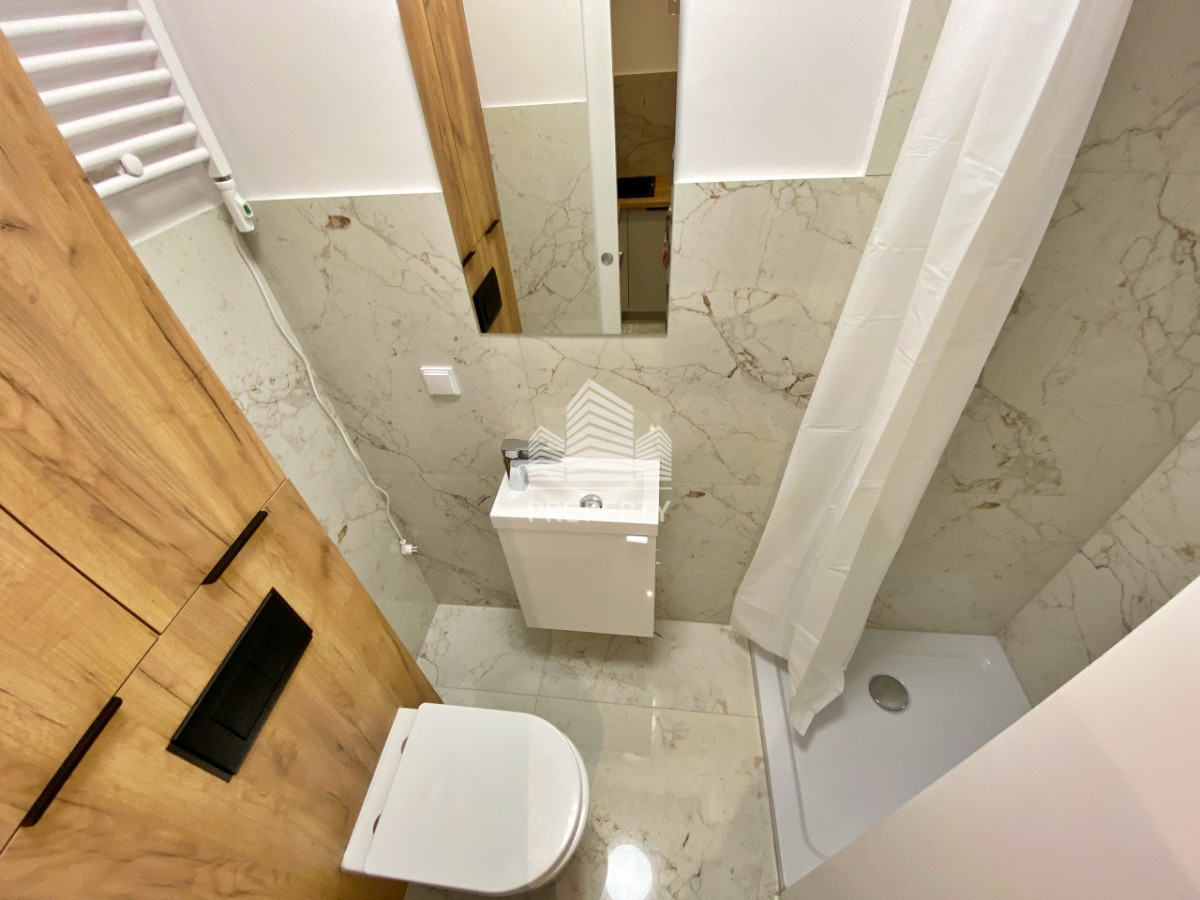 - w łazience prysznic, w pokoju rozkładana sofa, smart tv, w przedpokoju szafa w której zabudowano pralkę.