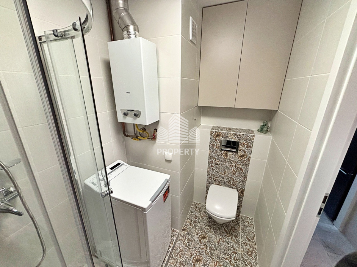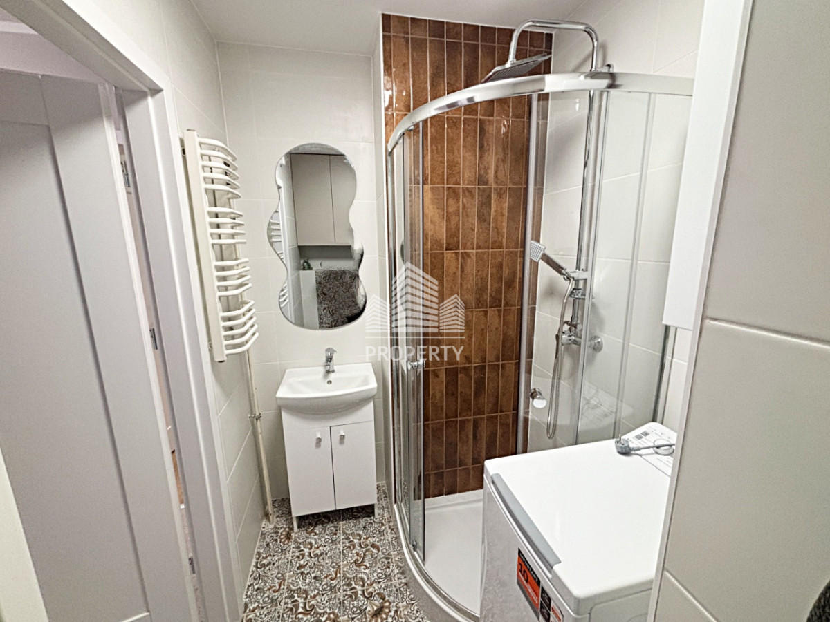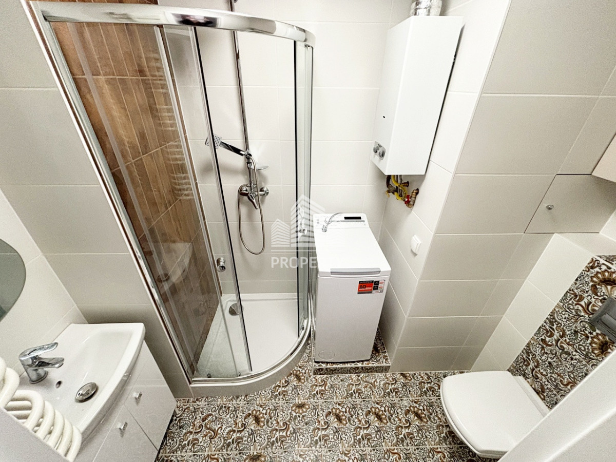 - łazienka z prysznicem i WC (ok.4m2), na wyposażeniu nowa pralka, zabudowana szafka na wymiar nad toaletą.